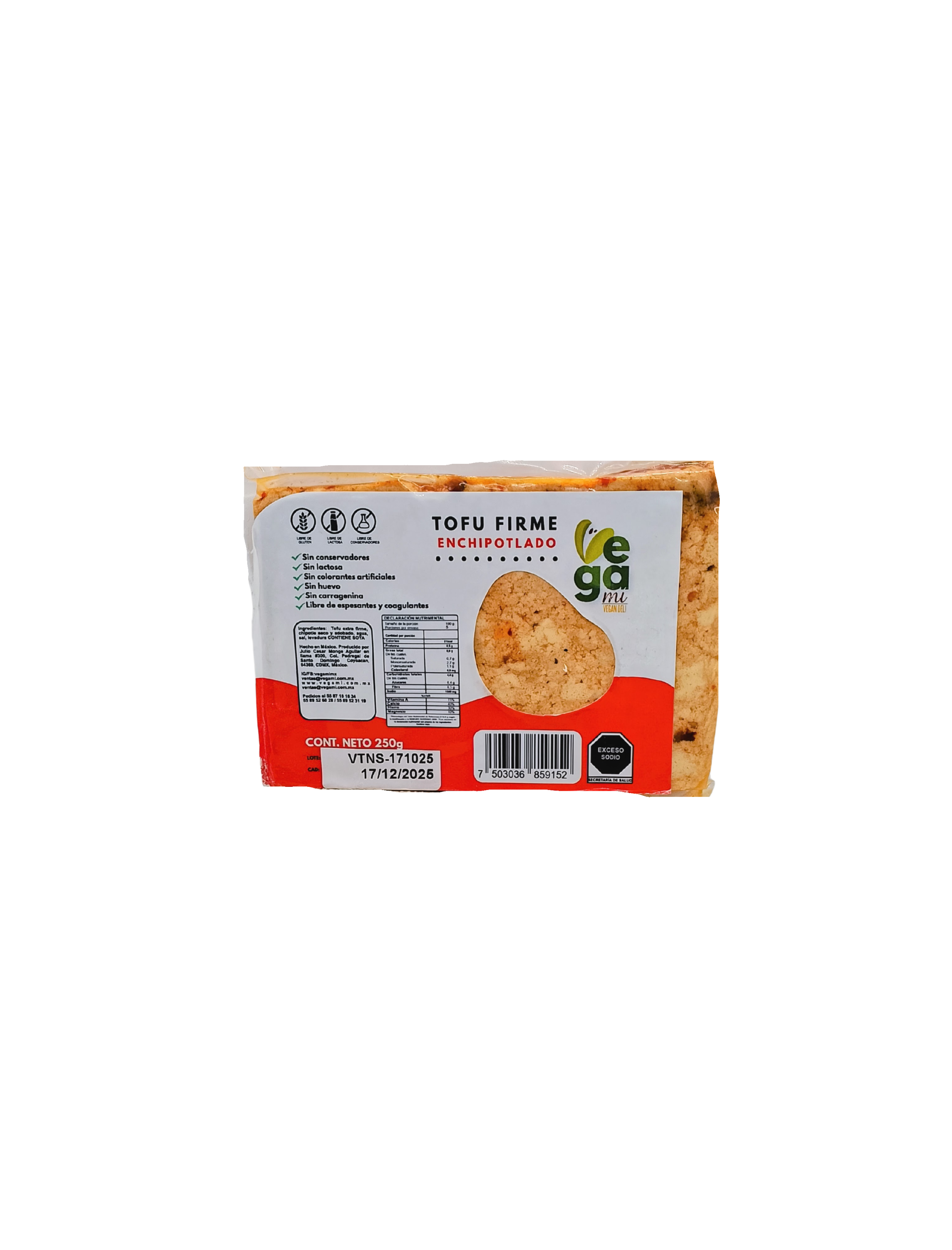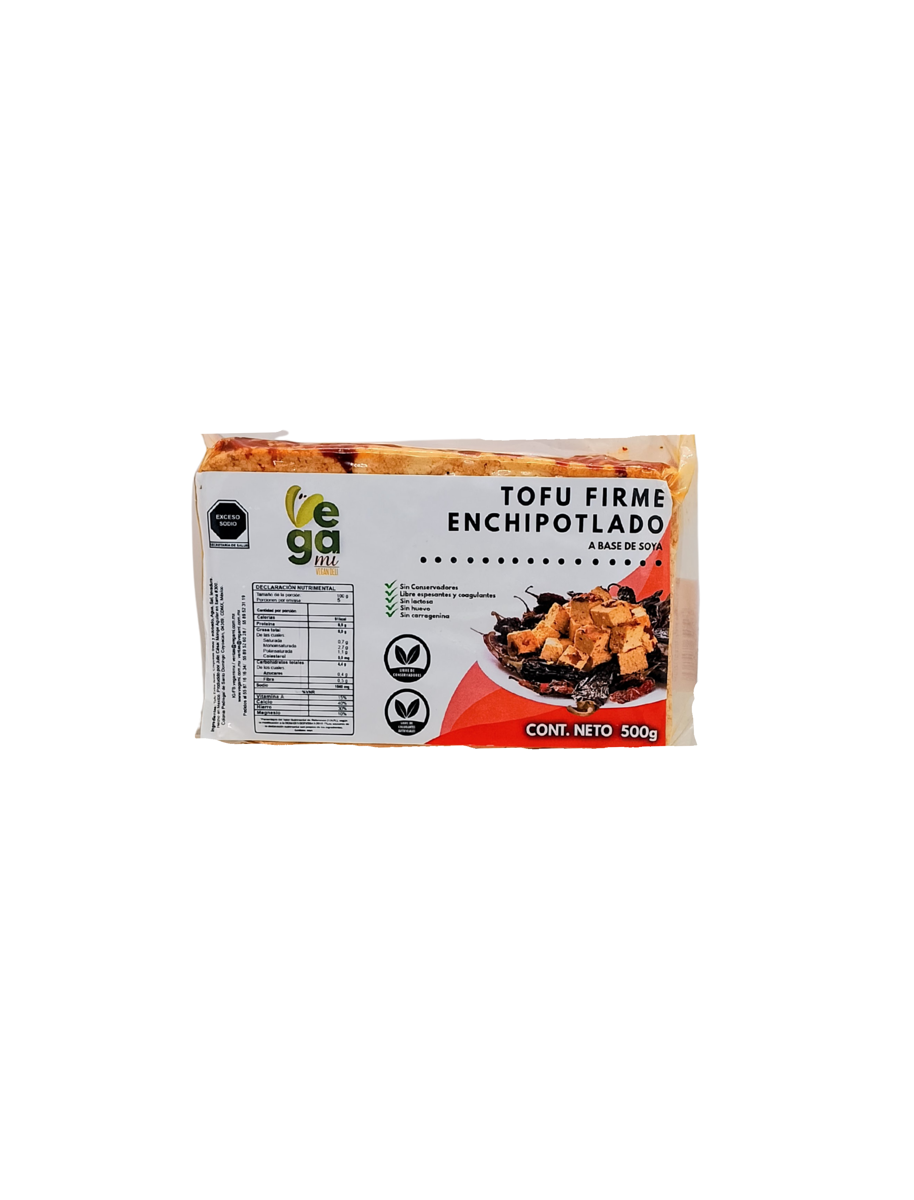 Tofu extra firme, chipotles secos y adobados, agua, sal, levadura.
