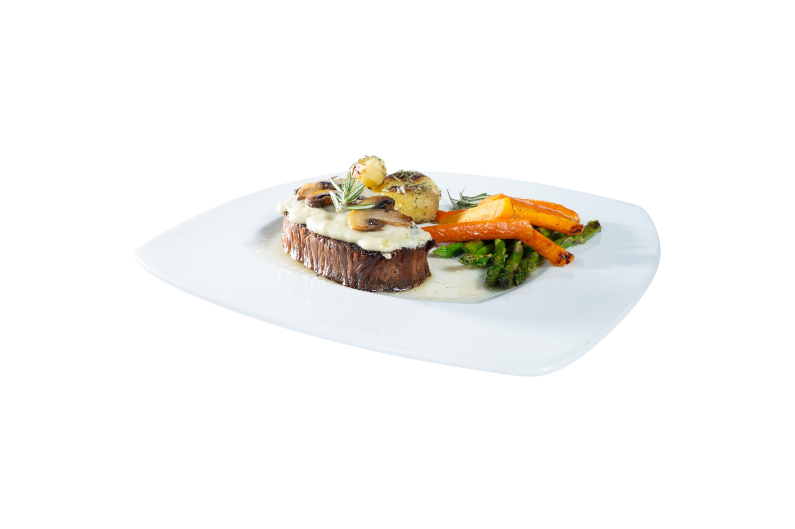 Medallón de seitán bañado en salsa blanca tipo Bechamel, con guarnición de verduras fescas a la plancha.